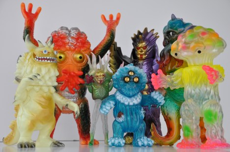שבע מפלצות, שבעה בתי עיצוב שונים מיוצגים כאן. מימין לשמאל "מאטאנגו" (M1Go), טרייפוס (maxtoy), קיטי-פייר (Super 7), גבֹּוֹרה (Target Earth), גרודנויד (Exohead), ראנגיס (T9G), ובאמצע אודורון כחלחל-שקוף (Gargamel)